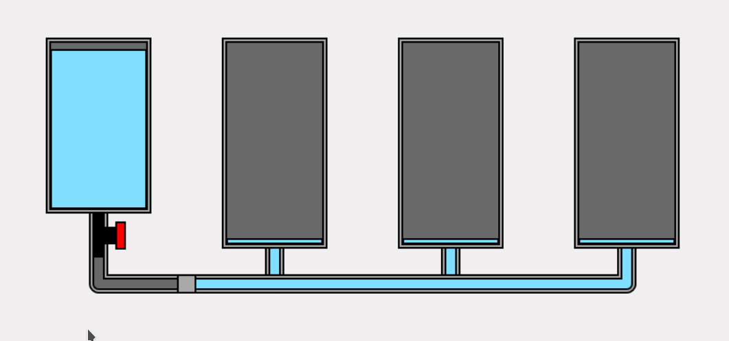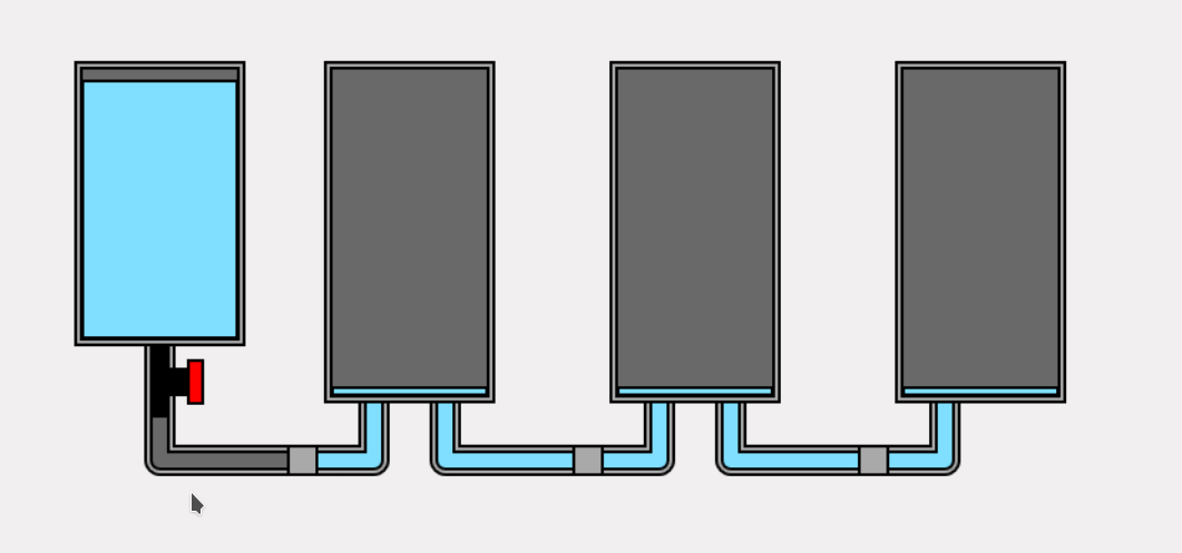 But there's a big problem: the algorithm doesn't handle the fact that the total amount of liquid must remain constant. Indeed, in this algorithm, the volume of water to move only depends on the pressure difference between the distributor and the tank, regardless of what's happening in other tanks. The algorithm therefore only works if 2 tanks are connected to a distributor; beyond that, the total amount of liquid in the system won't be constant. This is blatant in the following example: